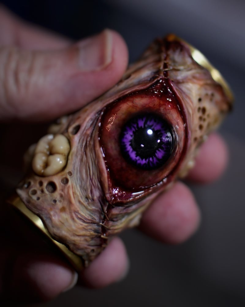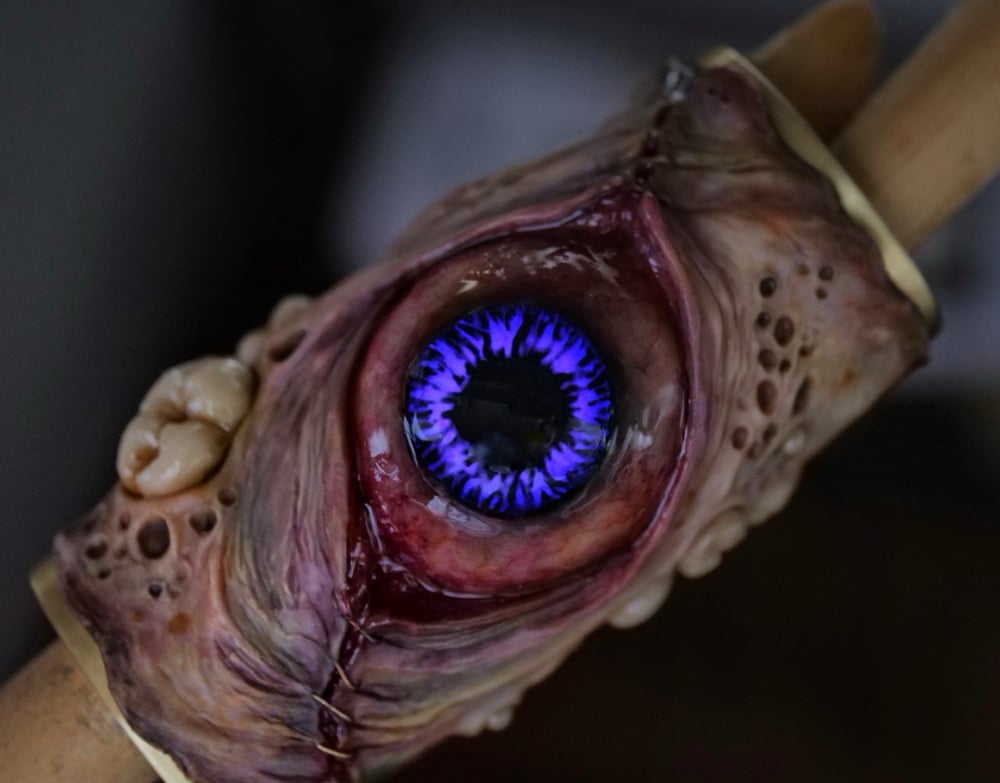 Deep blue/purple glow in the dark eyeball, the pupil is flash reflective.📸