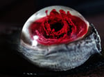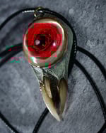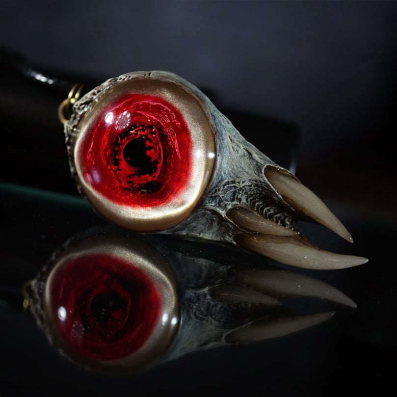 Bone textures, three fangs and a deep textured eye that resembles a splashing drop of blood frozen in time forever.