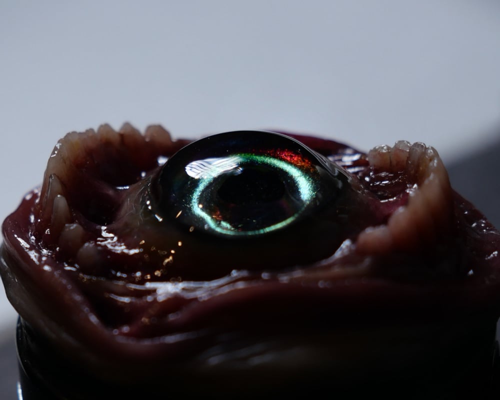Hand sculpted, hand painted, flash reflective/color shifting eye coated with protected finish.