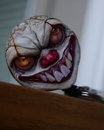 Hand sculpted pennywise face applied on a metal badge reel/keychain.