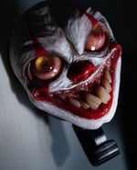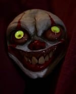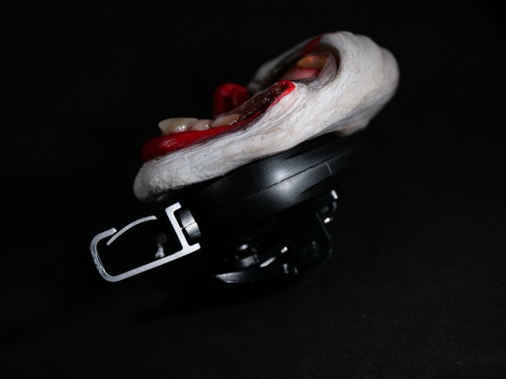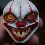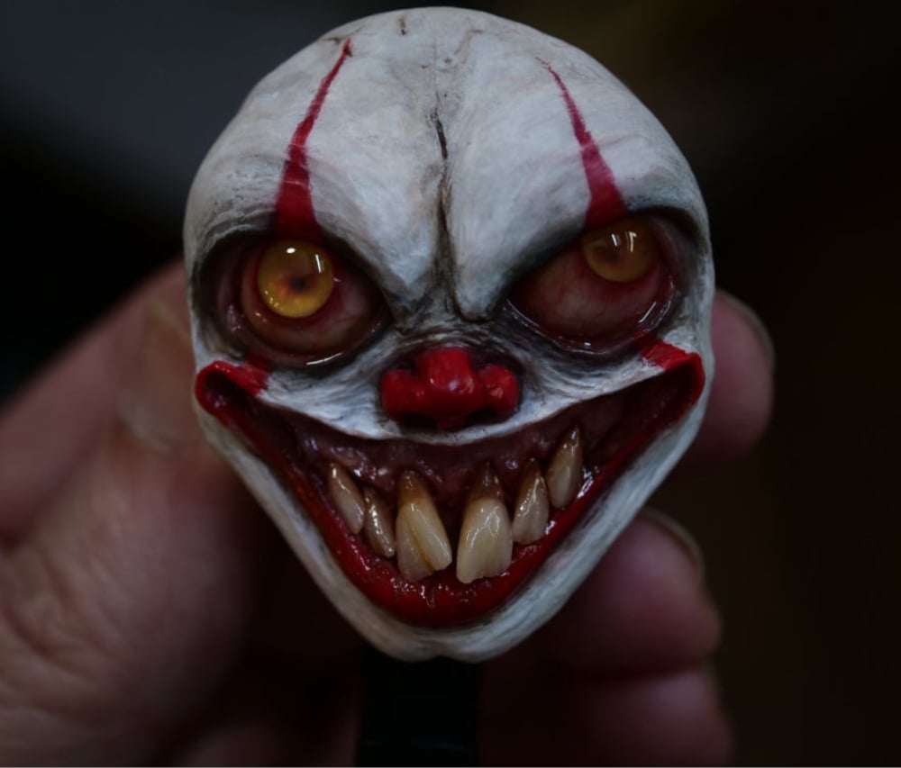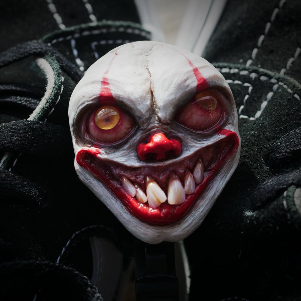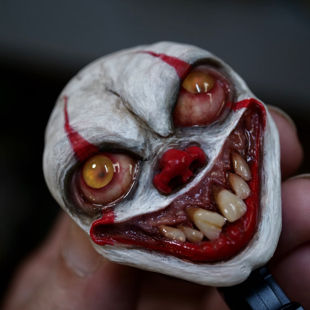 Hand sculpted pennywise face applied to a badge reel that is safe from magnetic interferences.