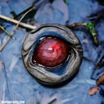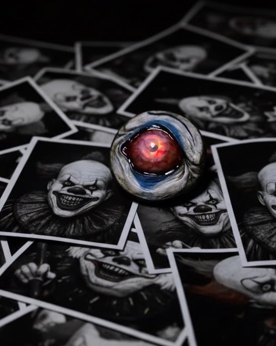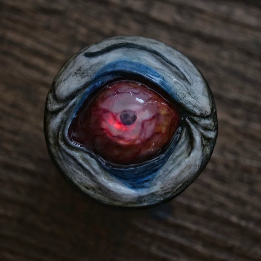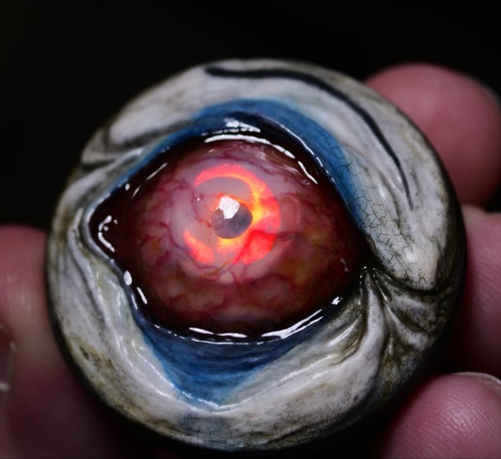 Hand sculpted and painted, the eye has a ton of depth, glows in the dark with flashes of color representing an inner evil within.