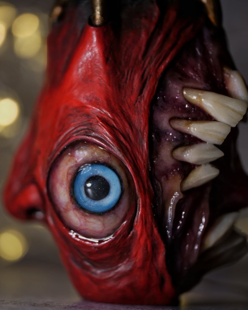 Made for Bic Minis. Hand sculpted onto a solid metal shell, featuring glow in the dark eyes, that are also flash reflective for that extra creep factor.