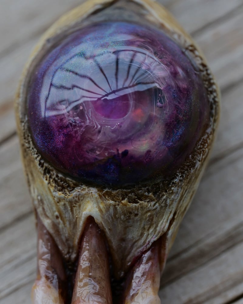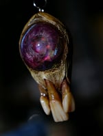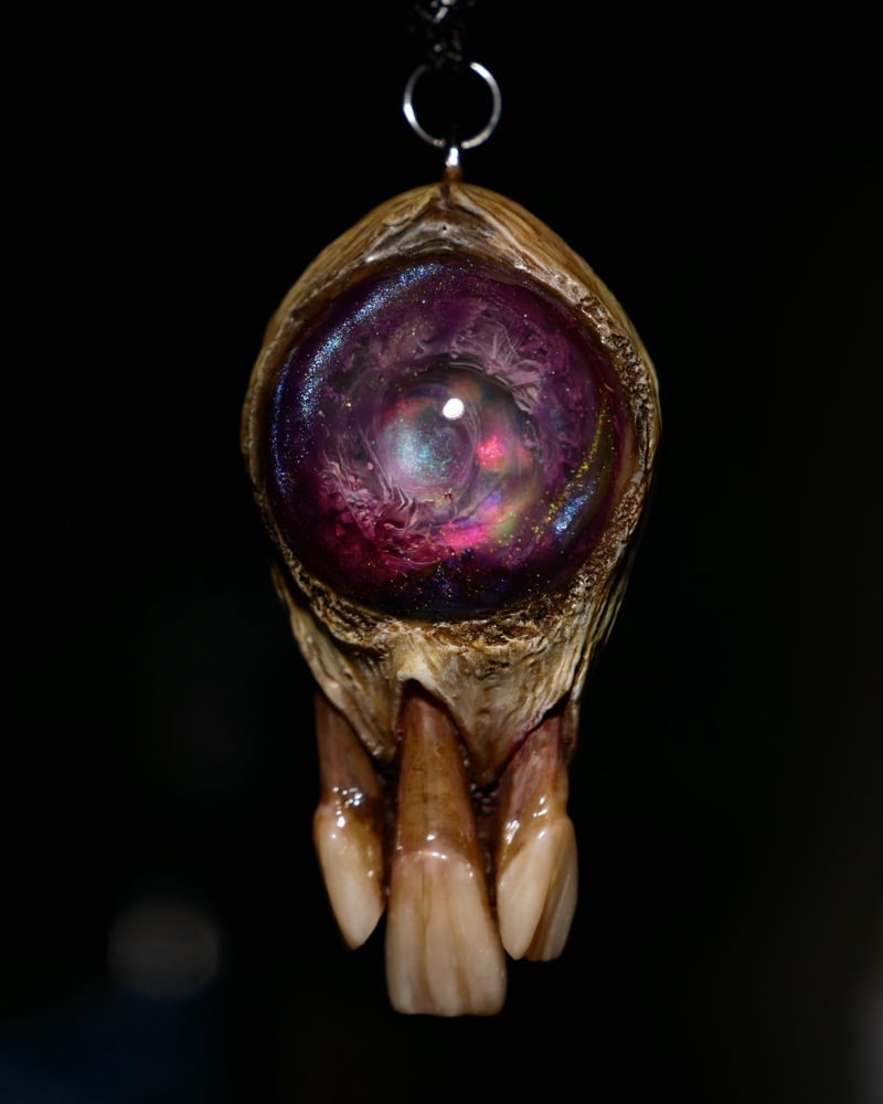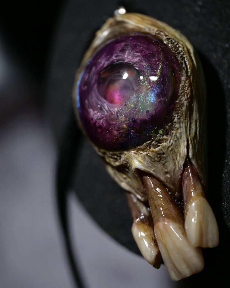 This cyclops has an eye that pops with shifting colors set in a body that is hand sculpted with aged, bone-like textures.