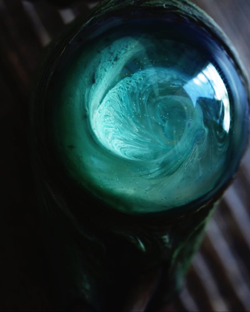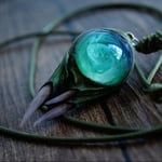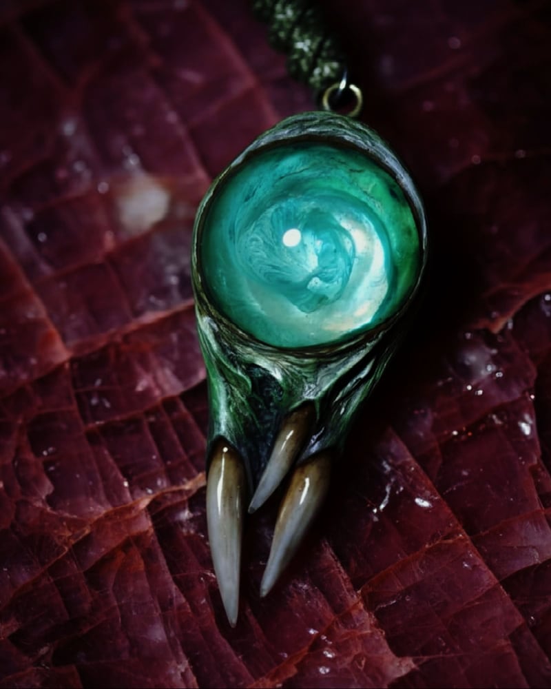 Bone textures, three fangs and a deep textured eye with lace-like swirls and waves that remind me of the ocean. Beyond the color waves there is a shimmery flash of bright blue.