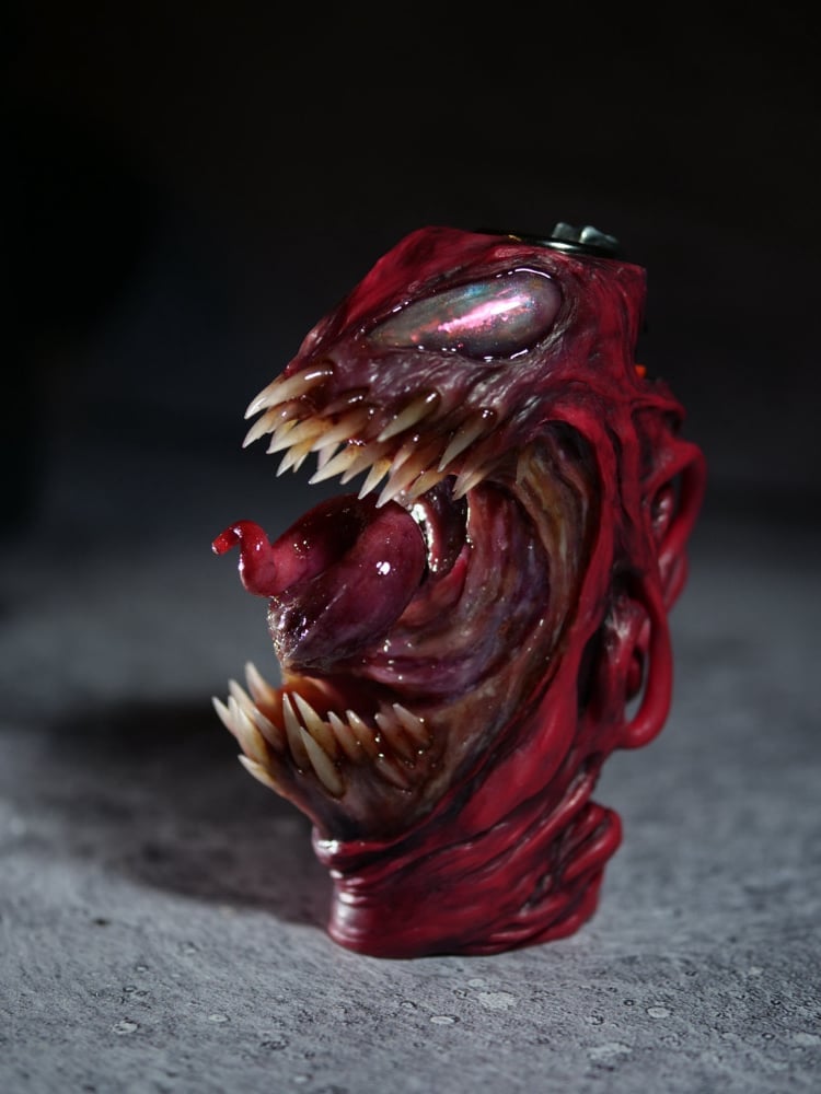 A super brutal version of the Carnage character hand sculpted onto a steel Clipper sleeve. Lots of small details including teeth, glowing eyes that flash and shift with life.