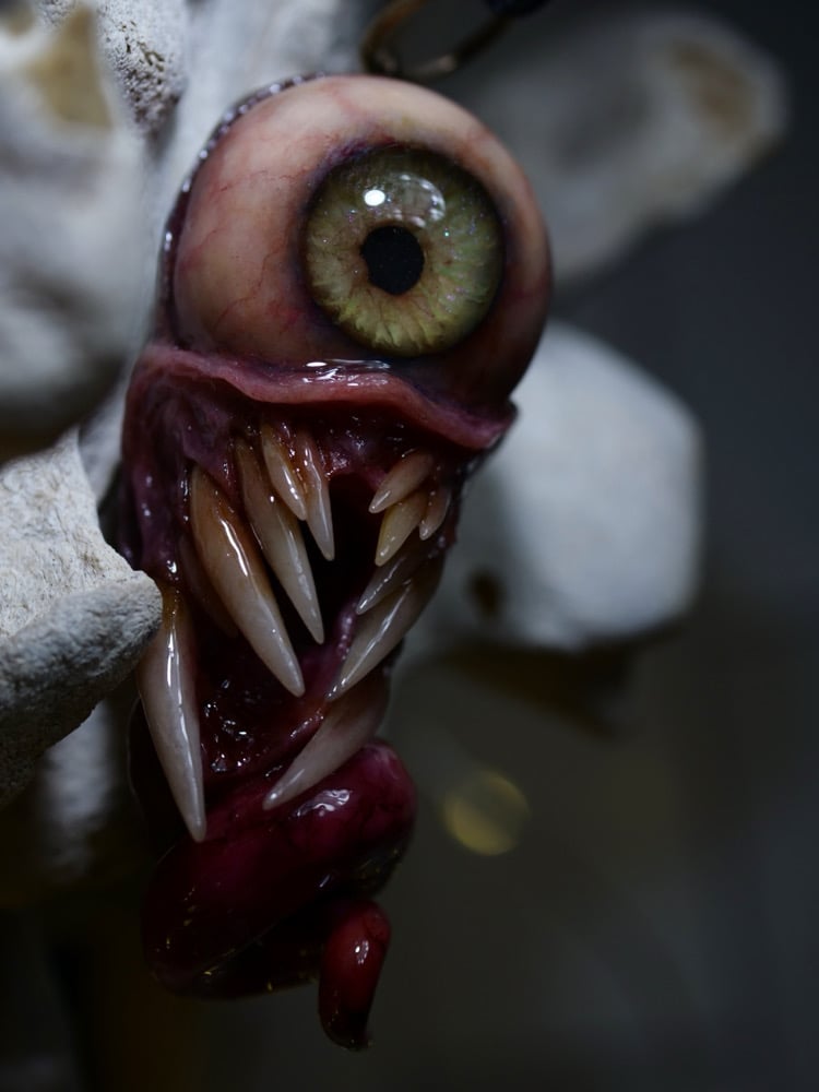 From the detailed, hand sculpted, glow in the dark, flash reflective eye to the realistic teeth this pendant is a real eye catcher.
