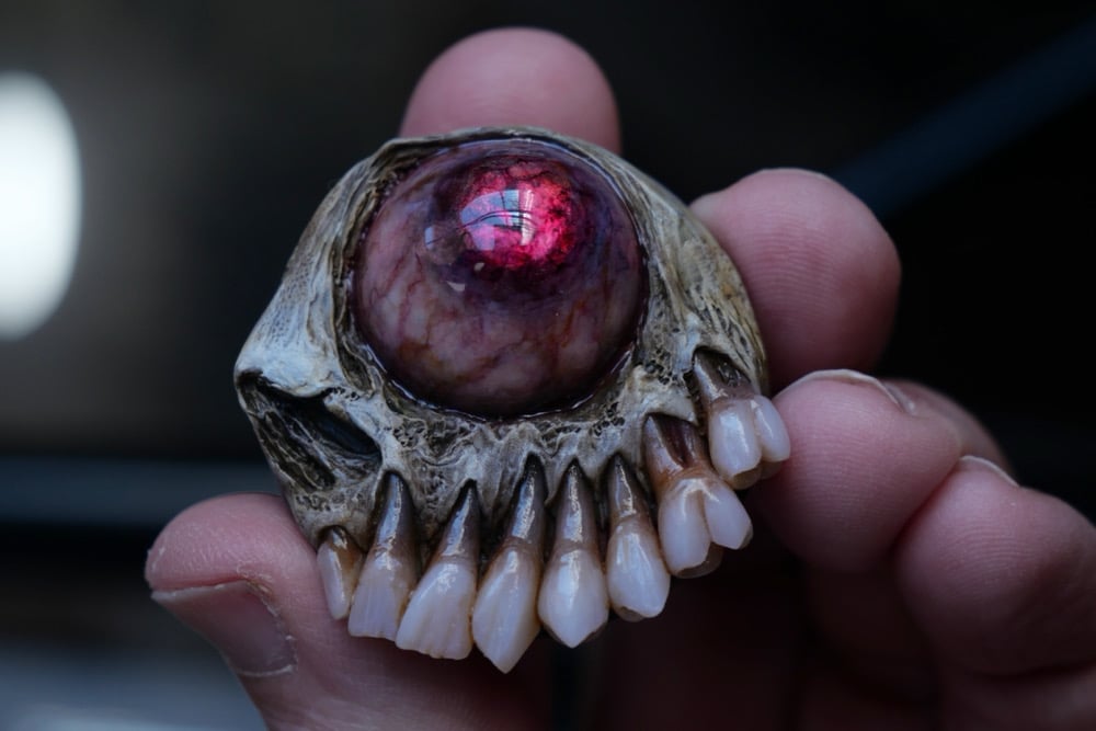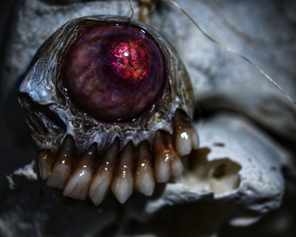 A protruding dead eye stares blankly, its glassy surface hinting at a life long lost, yet with a disturbing shimmer of something otherworldly within its depths. The most chilling detail? A grotesque, exposed set of decaying, stained teeth.